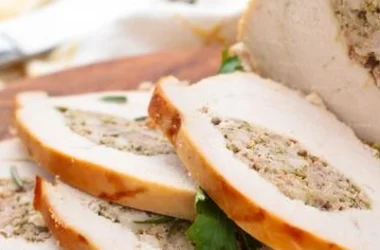 3. تحشى كلّ قطعة لحم بأربع ملاعق صغيرة من الحشوة وتُغلق بإحكام.