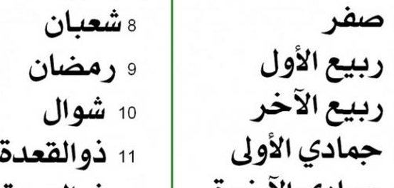 | الترتيب | اسم الشهر باللغة العربية | اسم الشهر باللغة الإنجليزية | عدد الأيام |
