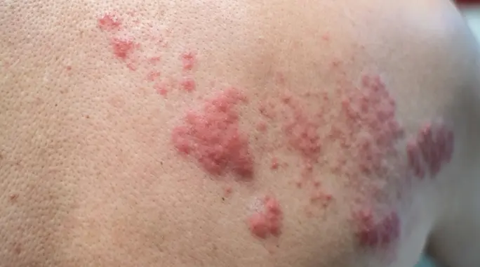 • ظهور بثور وبقع حمراء مؤلمة تتحول لاحقًا إلى بثور مملوءة بالسوائل.