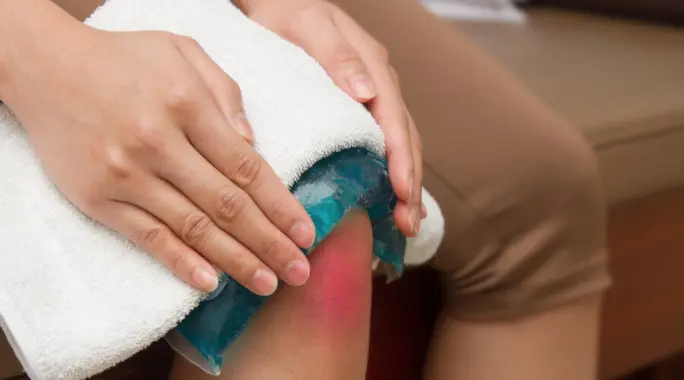 - تطبيق الثلج: ضع كمادة ثلج ملفوفة بقطعة قماش على الركبة المتورمة لمدة 15-20 دقيقة، عدة مرات في اليوم. يساعد الثلج على تقليل الالتهاب والألم.