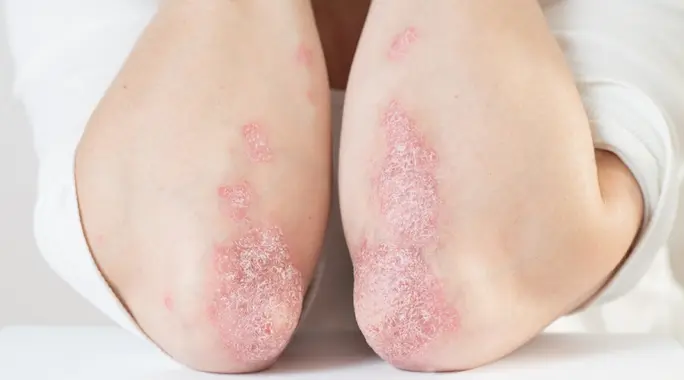 تؤدي الصدفية إلى ظهور بقع حمراء سميكة ومغطاة بقشور فضية أو متقشرة تسبب حكة شديدة. غالبًا ما تظهر هذه البقع على الركبتين، المرفقين، الأذرع، الجذع، وفروة الرأس.