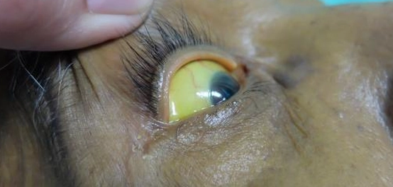 - اصفرار الجلد وبياض العينين والأغشية المخاطية (مثل بطانة الفم والأنف). يبدأ الاصفرار عادةً في الرأس ثم ينتشر إلى باقي الجسم.