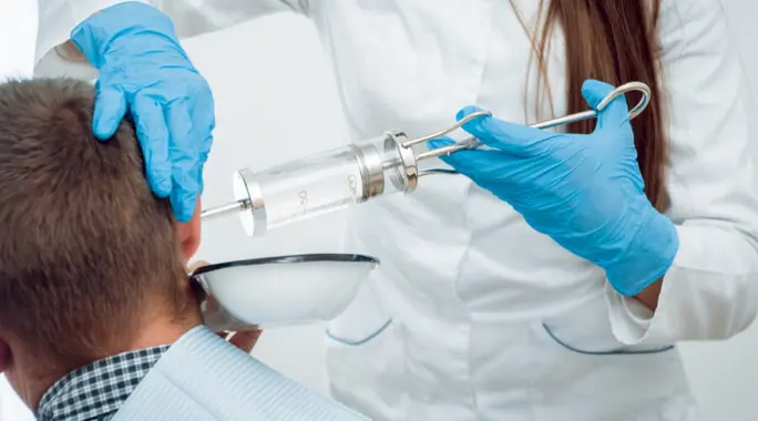 - تجهيز المحقنة: يستخدم الطبيب محقنة طبية خاصة تحتوي على ماء نظيف بدرجة حرارة الغرفة. استخدام الماء البارد أو الساخن قد يسبب الدوخة.