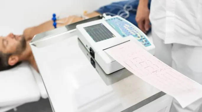 • تخطيط القلب الكهربائي (ECG): يسجل النشاط الكهربائي للقلب، مما يساعد في تشخيص مشاكل مثل الجلطة القلبية وأنواع معينة من تسارع القلب.