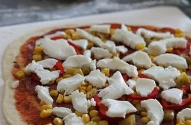 - مدّي العجينة بسمك رقيق، ثمّ وزّعي الصلصة فوقها، ثمّ وزّعي مكونات الحشوة.