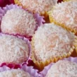 - تشكيل العجينة على هيئة كرات صغيرة ذات حجم متساوٍ، وتغليفها بجوز الهند المبشور بحيث يُغطّيها تماماً.