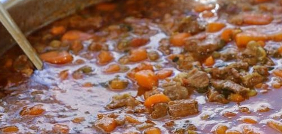 - أضف معجون الطماطم، وقلّب لمدة دقيقة. أعد اللحم، ورشّ الدقيق، وقلّب. أضف المرق.