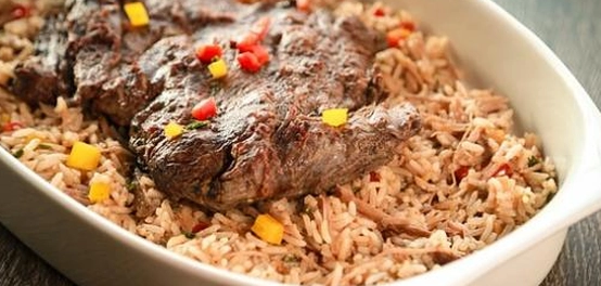 - سكب الأرز في طبق واسع، وزّع الأرز الملون على الوجه، ثم وزّع الحشوة، ووضع اللحم فوقها. قدّمه ساخناً.