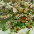 - سخّن الزيت في مقلاة، أضف الثوم، قلّب حتى يذبل، ثم أضف الكزبرة، قلّب، وأضفه إلى اليخنة. يُقدم مع الأرز.